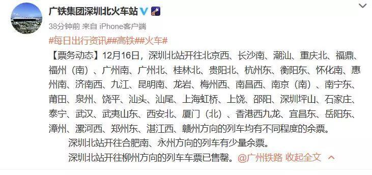 12月15日,深圳北车站官方微博发布票务动态消息:12月16日,深圳北站开往柳州方向的列车车票已售罄;