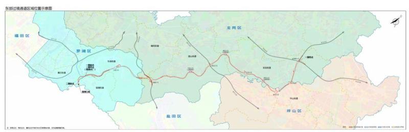 深圳市东部过境通道拟选址于罗湖区莲塘街道、黄贝街道和东湖街道,龙岗区横岗街道、园山街道和宝龙街道,坪山区坪山街道区域内。