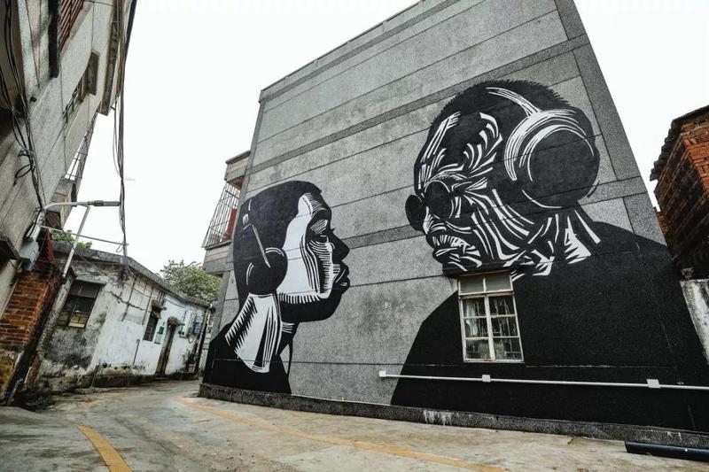 沙井古村的发展呈现新旧并存的的杂糅景观,和城中村复杂的人员结构(原住民以及外来务工家庭等)形成呼应。利用沙井老建筑创作一系列“伪古壁画”,古画的基调中揉进当地的现代元素制造超现实主义景观。同时在绘制手法上仿古造旧处理,混淆年代和时空,“伪造”一份似是而非的文化遗产。