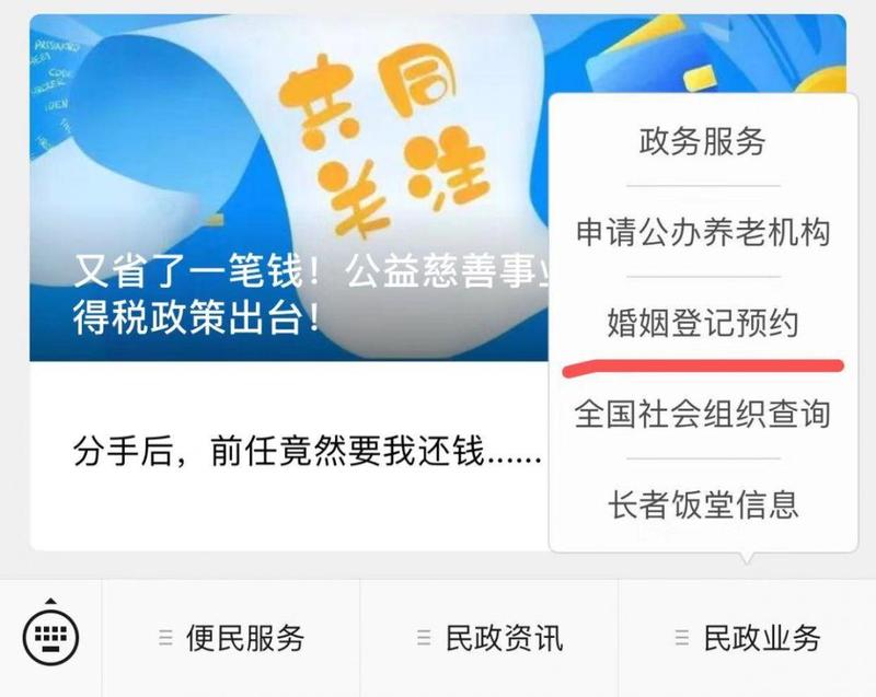 选择“民政业务”栏目下“婚姻登记预约”
