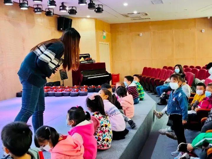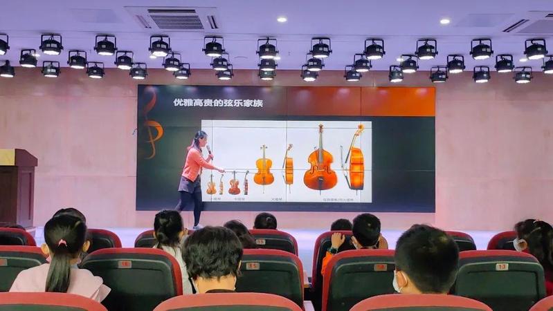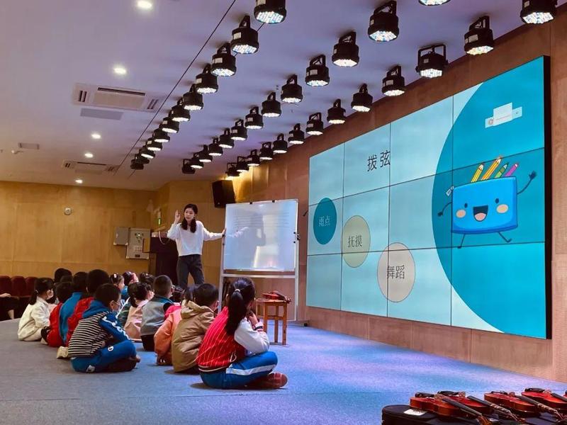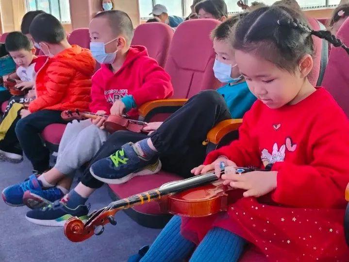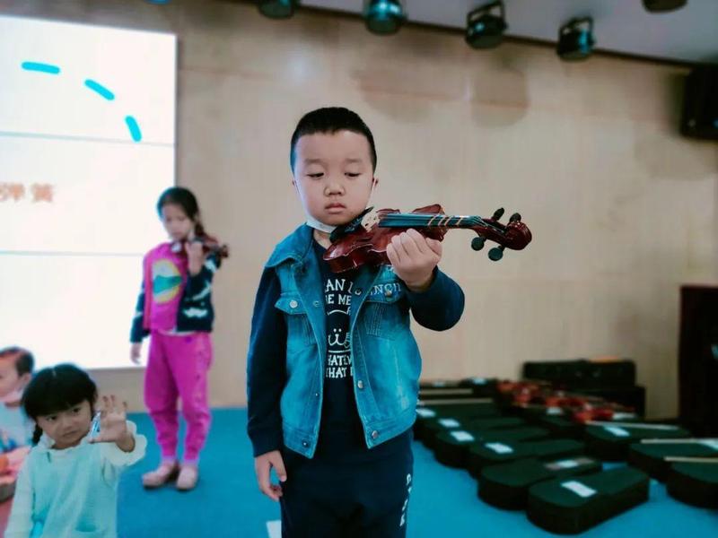 让孩子们坐在舞台上,围成一个半圆弧,每两个孩子发一把小提琴,以身体为小提琴的支点,跟随音乐节奏摇摆,手指敲击小提琴并跟随音乐节拍敲打,感受节奏节拍,小朋友使用琴弓与小提琴相互配合,拉出声音完成合奏,并与老师一起完成更高难度的合奏,最后跟随节奏拍手,完成节奏练习。