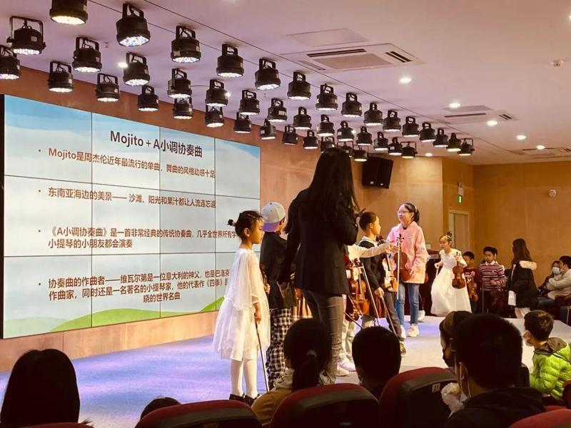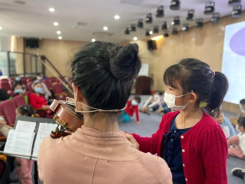 邀请音乐会的孩子来进行改编的乐曲表演,让体验班的孩子近距离的感受小提琴合奏的美妙,中场的时候,老师用小提琴模仿动物的叫声,让小朋友们猜测是什么动物,趣味学习。