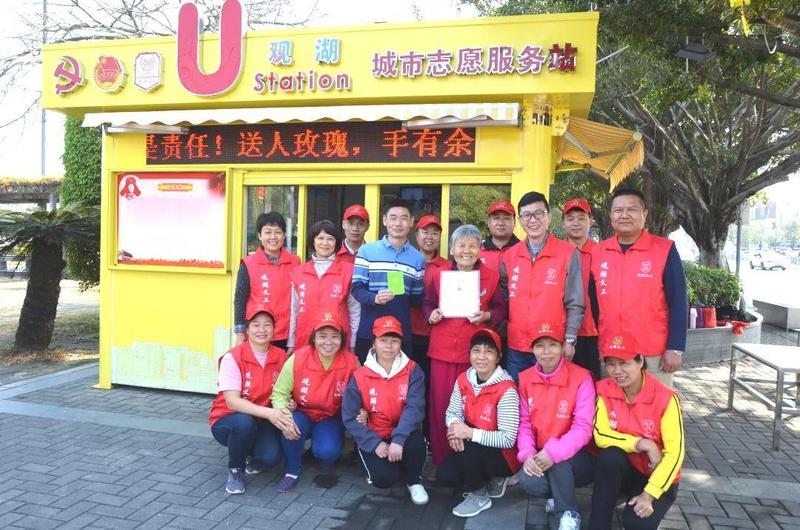 近年来,毛奶奶一直为U站捐赠药品供市民免费使用,在炎热的夏天捐赠凉茶给路口劝导的义工免费饮用。今年2月4日观湖街道团工委聘请毛爱娣为观湖城市U站荣誉站长。