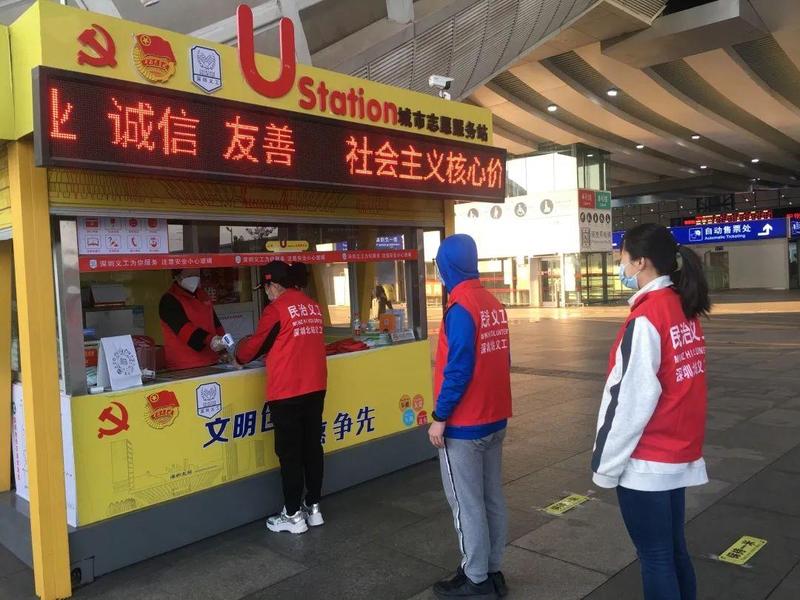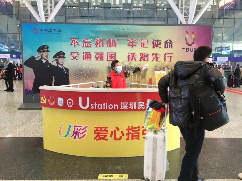 从1月28日开始至3月8日40天春运期间,深圳北站日均招募100人次义工,在志愿服务U站(服务岗)、东西广场、进出站口、售票处、中转换乘等服务点,为旅客提供咨询、指引、疫情防控健康扫码、手机应急充电、爱心电话、爱心捐款、失物招领、应急药箱、针线包、特殊人群帮扶等志愿服务,每天累计服务400余小时。