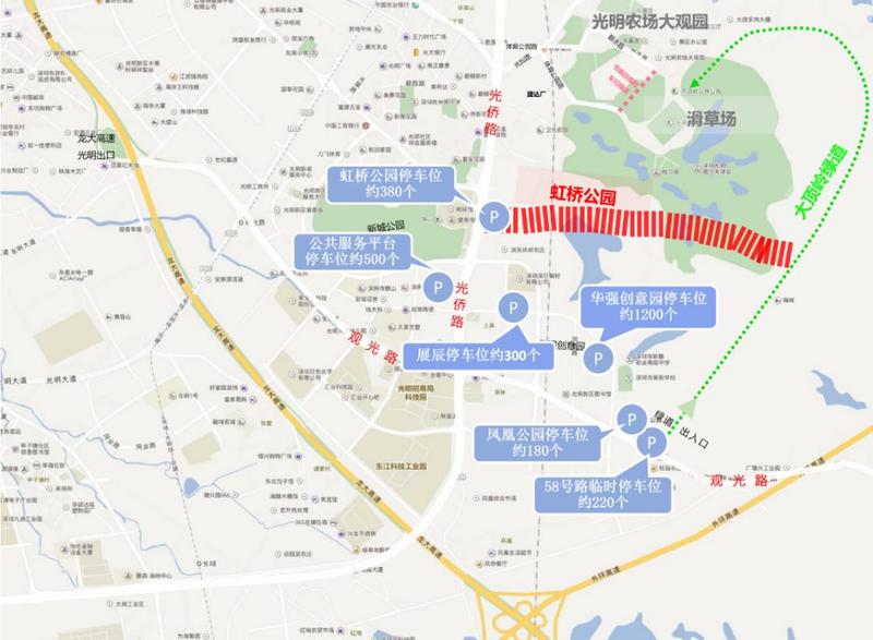 接驳路线(往返):“虹桥公园”←→“牛根坳创意园”←→“光明小镇·欢乐田园”←→“科学城展厅”