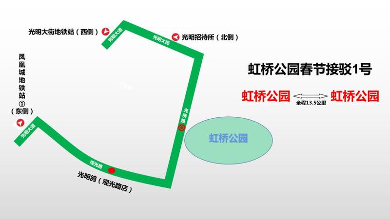 接驳路线(循环):“虹桥公园”→“光明招待所”→“光明大街地铁站(地铁6号线)”→“虹桥公园”→“光明鸽”→“凤凰城地铁站1(地铁6号线)”→“光明鸽”→“虹桥公园”