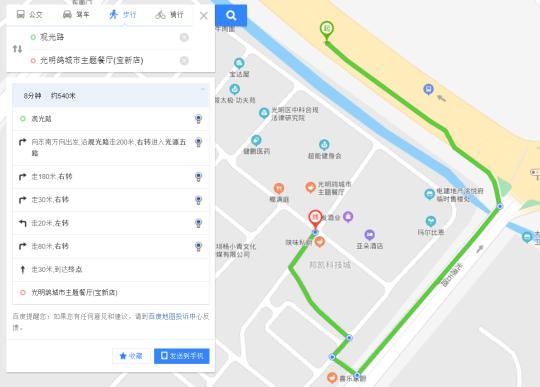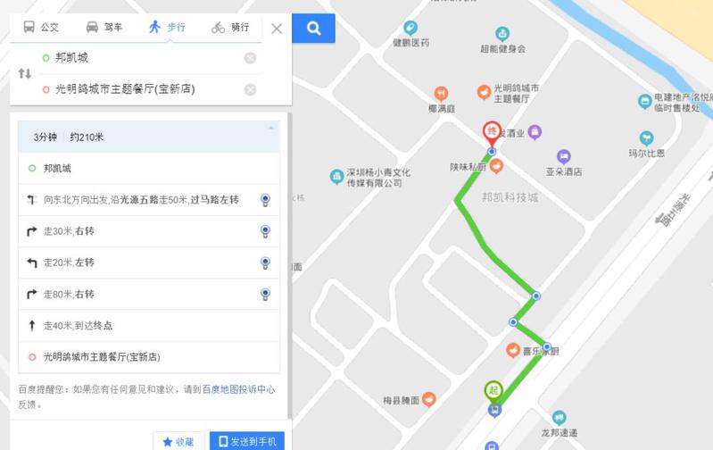 2.搭乘公交抵达“邦凯城站”后,向东北方向出发,沿光源五路走50米,过马路左转,走30米右转,走20米左转,走80米右转,走40米,到达目的地。