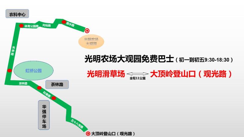 接驳线路(往返):“光明农场大观园/滑草场”←→“农科中心”←→“虹桥公园”←→“茶林路”←→“华强创意产业园”←→“大顶岭登山口(观光路)”