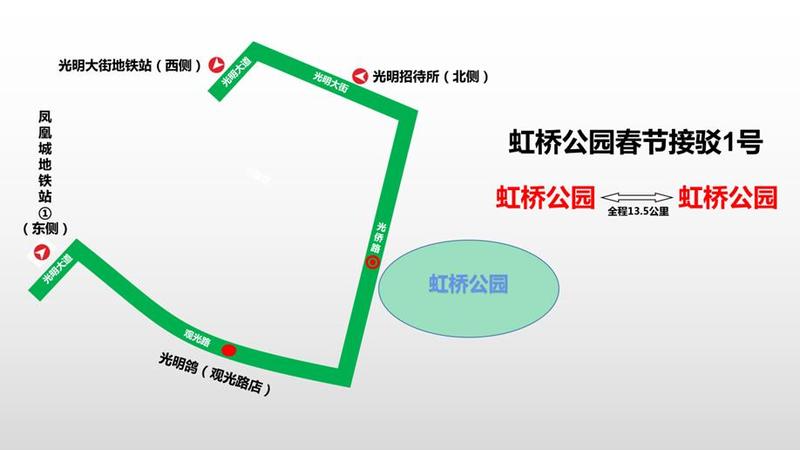 接驳路线(循环):“虹桥公园”→“光明招待所”→“光明大街地铁站(地铁6号线)”→“虹桥公园”→“光明鸽”→“凤凰城地铁站1(地铁6号线)”→“光明鸽”→“虹桥公园”