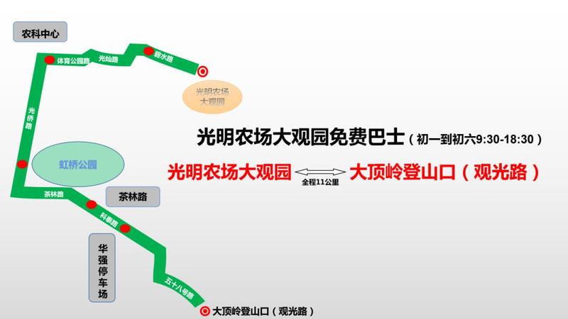 接驳线路(往返):光明农场大观园/滑草场←→农科中心←→虹桥公园←→茶林路←→华强创意产业园←→大顶岭登山口(观光路)