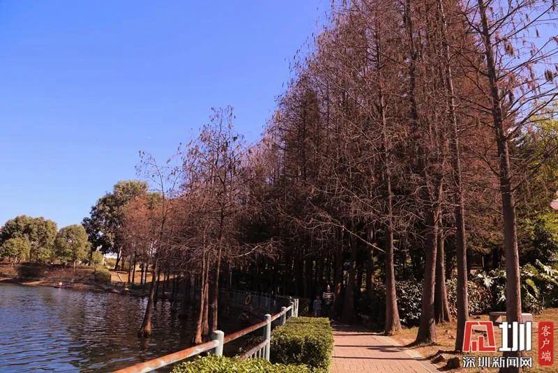 围绕湖周围的,就有颜色各异的簕杜鹃,与湖面照映,别有一番风味。环湖边还有一片落羽杉,秋冬季节,彩叶斑斓,美不胜收。
