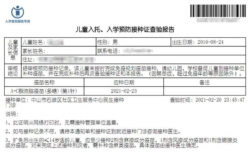 系统会自动生成《儿童入托、入学预防接种证查验报告(未完成)》,并列出补种疫苗的种类和时间。