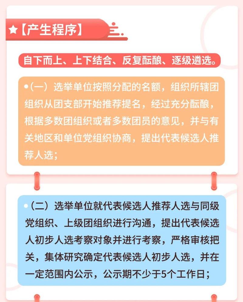 (一)选举单位按照分配的名额,组织所辖团组织从团支部开始推荐提名,经过充分酝酿,根据多数团组织或者多数团员的意见,并与有关地区和单位党组织协商,提出代表候选人推荐人选;