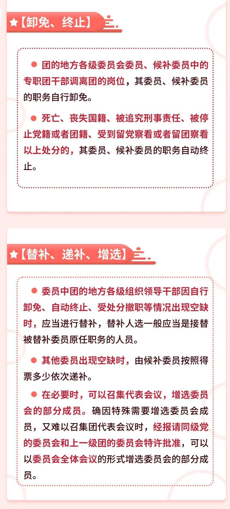 第五十七条 团的地方各级委员会委员中团的地方各级组织领导干部因自行卸免、自动终止、受处分撤职等情况出现空缺时,应当进行替补,替补人选一般应当是接替被替补委员原任职务的人员。替补名单由各该级团的常务委员会提出,交委员会全体会议确认。替补的委员按照姓氏笔画为序列入原委员名单中。