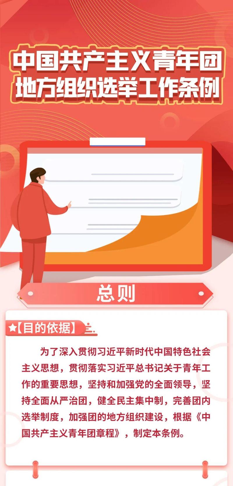 第一条 为了深入贯彻习近平新时代中国特色社会主义思想,贯彻落实习近平总书记关于青年工作的重要思想,坚持和加强党的全面领导,坚持全面从严治团,健全民主集中制,完善团内选举制度,加强团的地方组织建设,根据《中国共产主义青年团章程》,制定本条例。