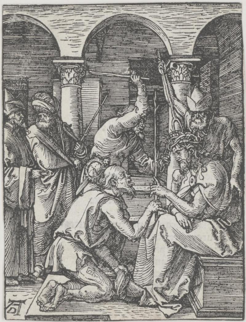 《耶稣加冕荆棘》为《小受难》系列中的第19幅作品,图像左下角标志性A.D署名,无日期,据记载作于1509年。自然光线下,肉眼可见:墨色莹润,线条细腻,高质量的印刷品质使之画面的三维空间表达完美。背面拉丁文印刷文字为活字印刷,与博物馆背书藏品之排版完全一致。本案边缘按木板框线裁切,纸张使用同时期高品质直纹纸,背面右侧可见部分水印M.309 Fish Bladder,为1510-1511年间丢勒印刷作品的常用纸,参见同时期作品《David penitent》《Saint Jerome in his Cell》《The Assumpiton and Coronation of the Virgin》。作品保存质量完好,属书籍/画册裁切,纸张白色无受损或是修复迹象。