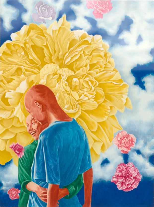 早在方力钧创作出他的成名作时期,他就对鲜艳的花朵钟爱有加。但他对鲜花、繁花的理解,却带着矫饰、不真实的意味。他同时期的艺术家因之开创出后89艺潮中一个重要流派:艳俗艺术。但方对此只是“借用”,并未主题先行。从云端的作品开始,鲜花也堂而皇之地占据了重要位置,极尽烘托、渲染之能事。场面浩大、色彩缤纷。