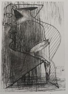 此幅铜版作品《无题》是他在1971年90岁高龄时创作的少有的在画面中不直接包含性暗示的版画作品,因此反而弥足珍贵,画面中的人物伸长脖子凑到画面的黑暗边角的侧面人像,有一只睁大的眼睛,这只眼睛却突破三维的局限在侧脸上正面朝前的,显示出窥视且让人无处躲藏的感觉,而螺旋升腾而起冲上头脑的“黑天使”揭示着隐藏的动力,更是升华了这种窥视的意味。这件作品画面几乎全部采用凹版干刻的技法,艺术家用钢针在金属版上刻画出一条条较深伤痕,画面的右边留白来凸显另一边的阴暗,空白处的上方的刻痕,以及下方横向快速刻画的排线,使偏重的画面构图的趋于稳定。