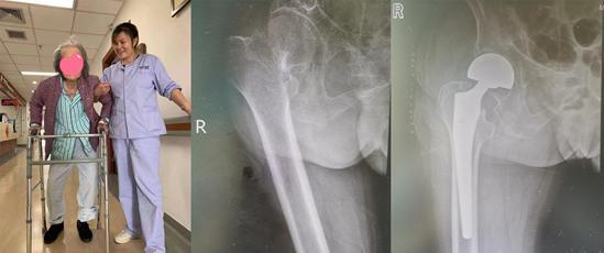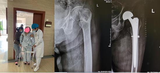 ▲江奶奶进行“半髋关节置换术+钛缆内固定”后,恢复行动能力