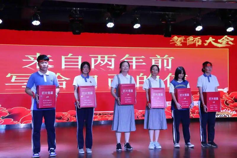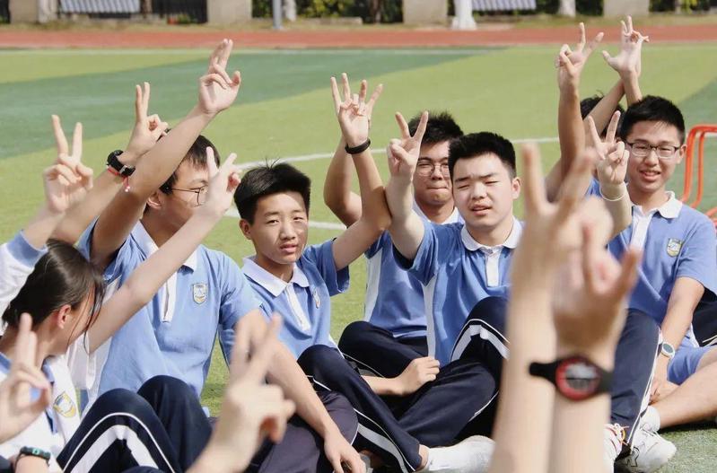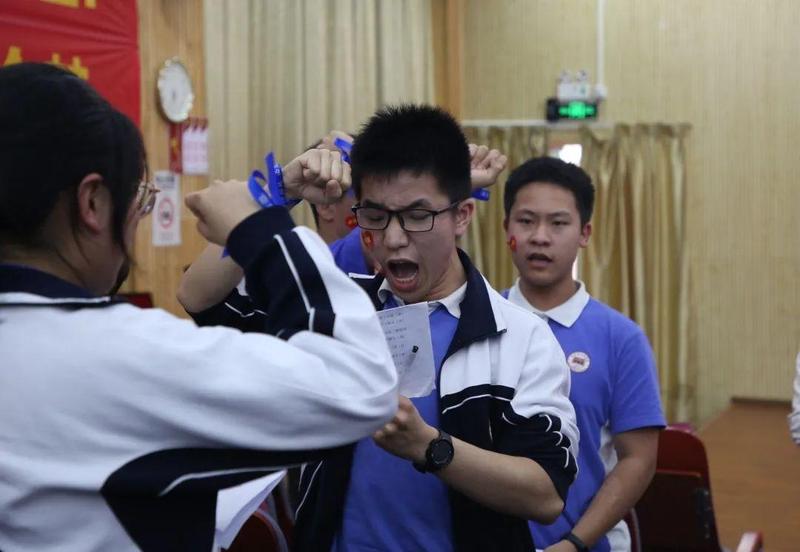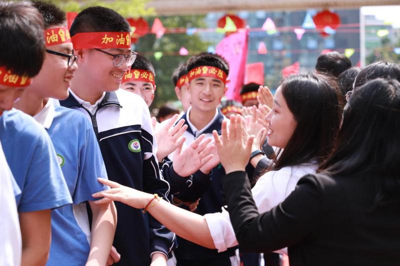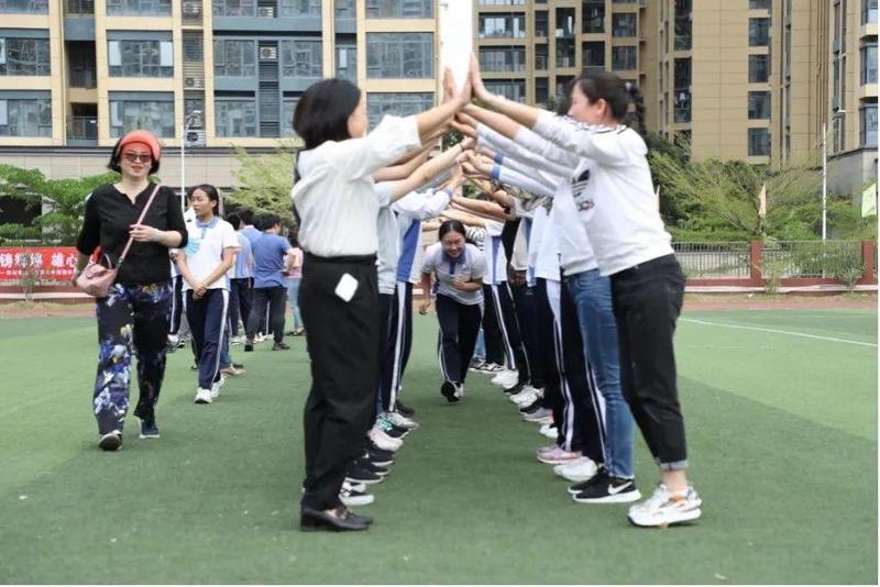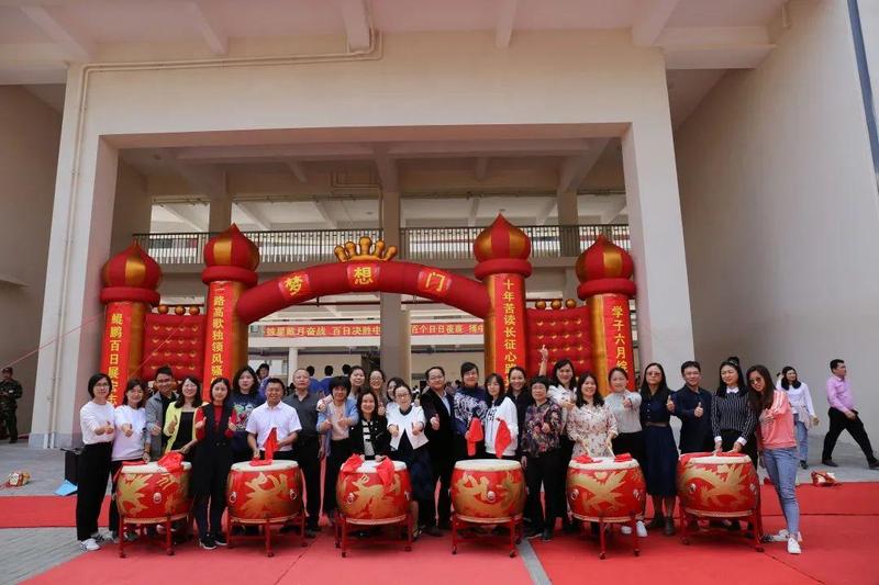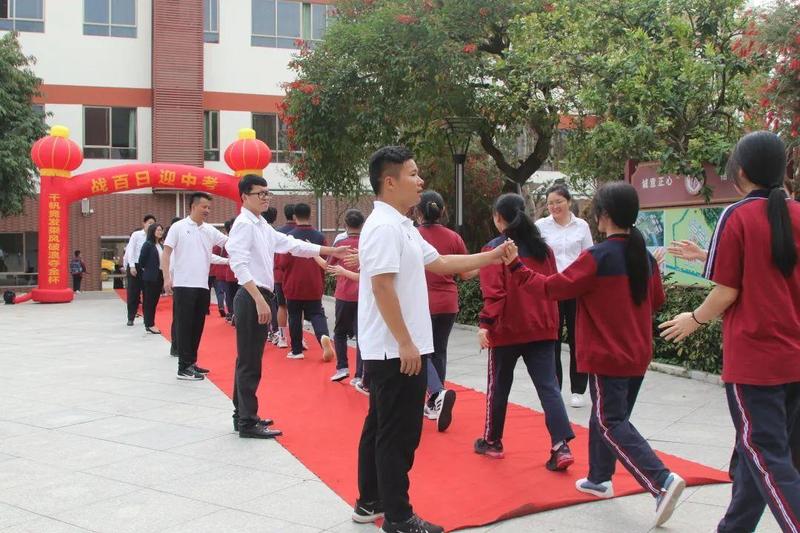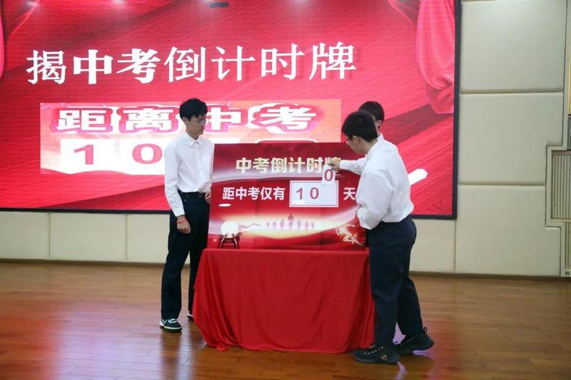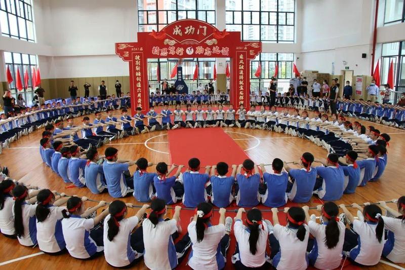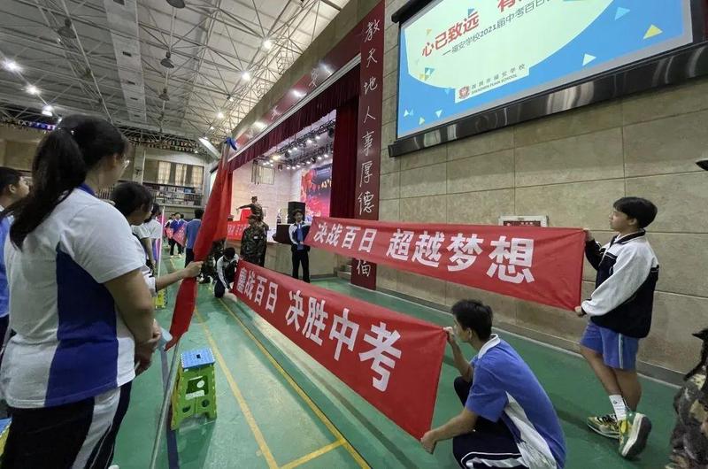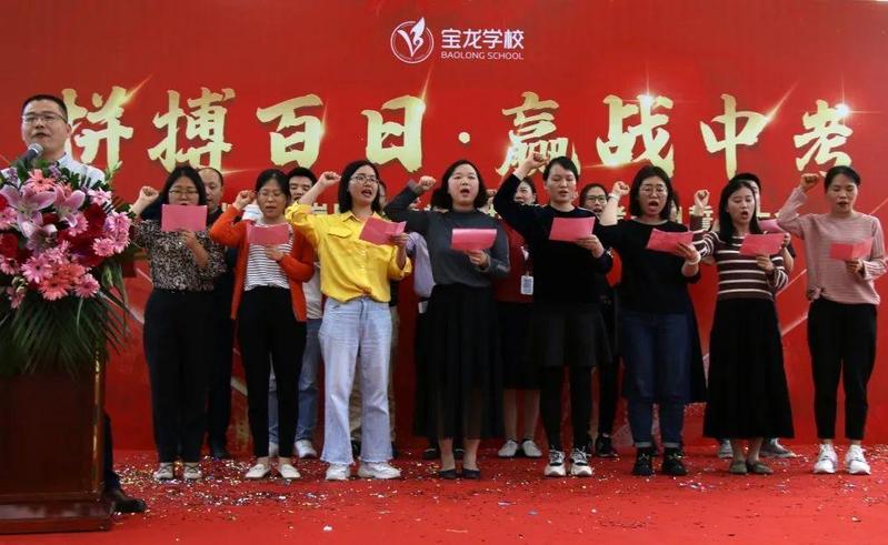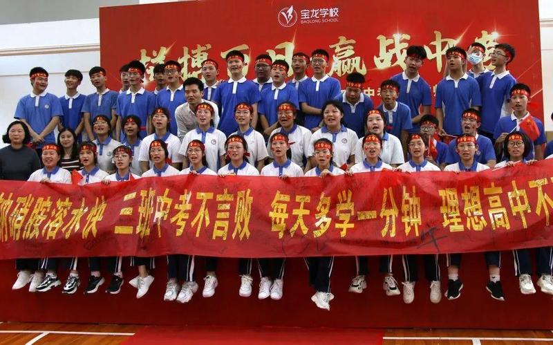 手持国旗,头绑“中考必胜”红丝带,与老师、家长击掌汲取力量,迈着坚定步伐跑步跨入“成功门”,校长与学生共同揭开“赢”字造型的倒计时牌,举拳宣誓,班级之间互下战书,拓展游戏中学会合作……这就是宝龙学校别具一格的“中考百日誓师大会”。