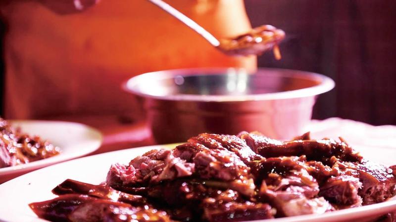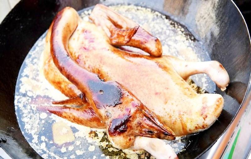炉灶边、油锅里,一只鹅被反复翻转,渐渐“穿”上了金黄外衣,空气中弥漫着诱人香味。同时翻滚着的还有鹅肚里的酱料,不断渗入鹅肉,由里而外,加速鹅的变化。一个多小时后,色香味俱全的碌鹅被端上了桌,食客们不禁食指大动,眼中、口中、心中都被这一碟碌鹅占满……