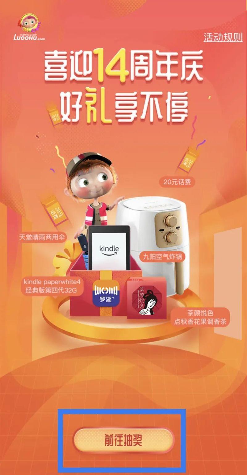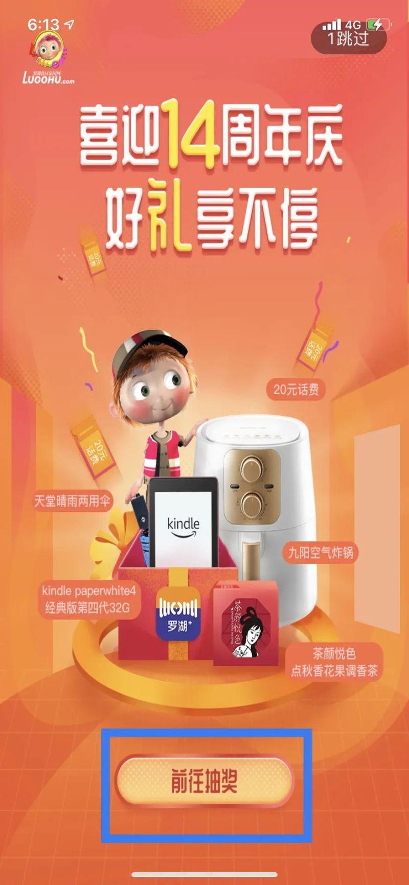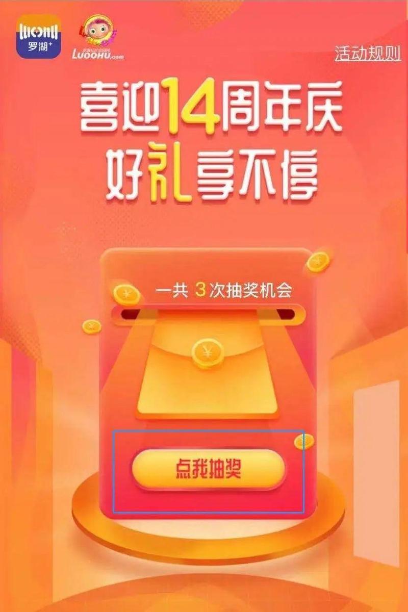 【2】直接点击APP开屏页面进入抽奖,或者进入APP后点击“喜迎14周年庆,好礼享不停”悬浮窗口进入活动页面。
