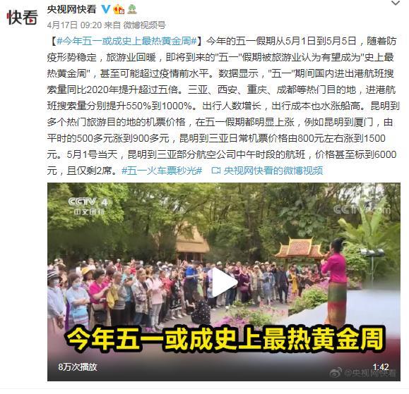 携程近日发布“五一”黄金周预测报告:今年“五一”出游或将达到2亿人次。从携程当前“五一”机票、酒店、门票、租车订单量对比2019年的显著增长来看,今年“五一”旅游人次有望突破2019年“五一”水平。携程研究院行业分析师方泽茜预测,伴随着国内疫情的有效管控、政府部门持续放开出行限制、鼓励和推动旅游业发展的态度,即将来临的“五一”假期有望迎来“爆发式”出游。