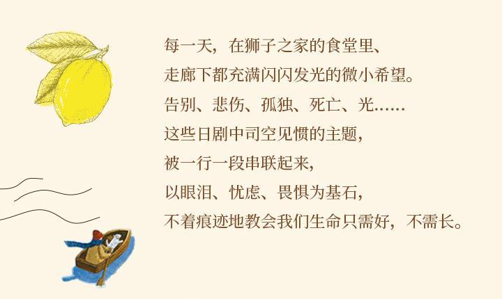 每一天,在狮子之家的食堂里、走廊下都充满闪闪发光的微小希望。告别、悲伤、孤独、死亡、光……这些日剧中司空见惯的主题,被一行一段串联起来,以眼泪、忧虑、畏惧为基石,不着痕迹地教会我们生命只需好,不需长。