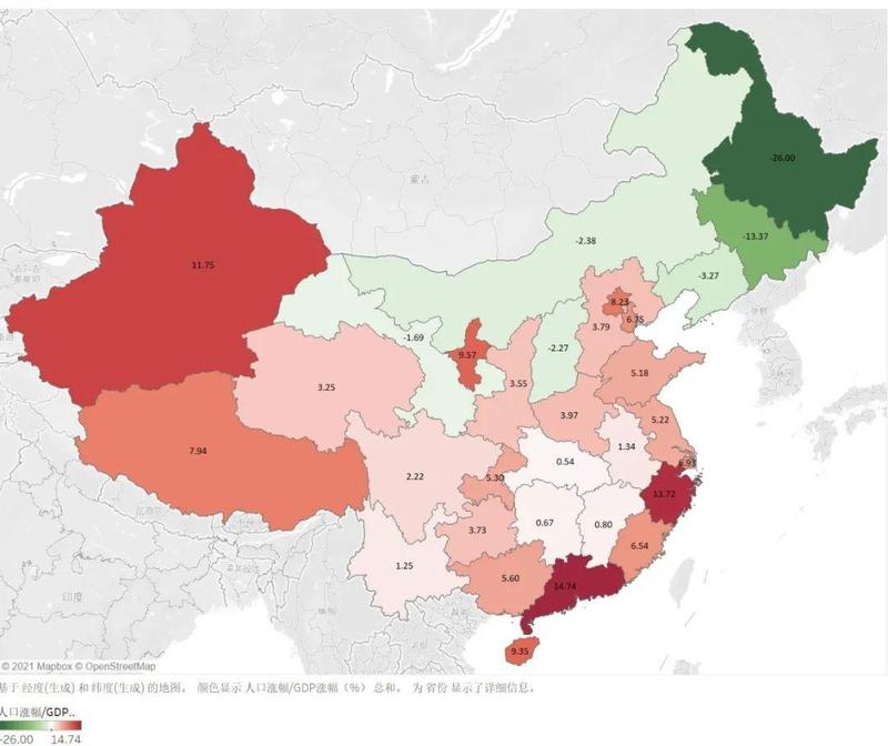 一方面,经济发达的东部沿海和南方各省经济体量更大,承载人口能力更强,西部几个红色的省份也用单位GDP带动了更大的人口增长率;