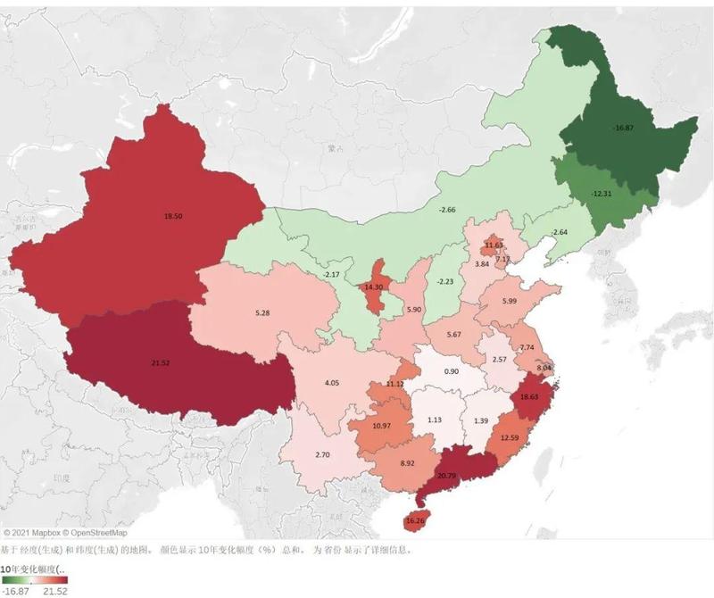 如果从各省份十年间的人口数量变化幅度来看,在地图上是否会更为直观?笔者通过查找对比六普和七普数据,以同种方式绘制了两次人口普查期间各省份人口的增长率地图。