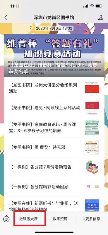 1、关注深圳市龙岗区图书馆微信公众号,点击微服务大厅。