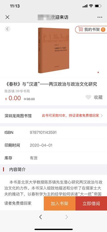 3、选择所需图书加入书架。如果图书符合购买规则,则加入书架按钮可用,否则加入书架按钮变灰,不可点击。(具体的购书规则请查看平台内的“借书指南->常见问题”)。