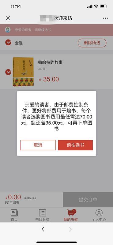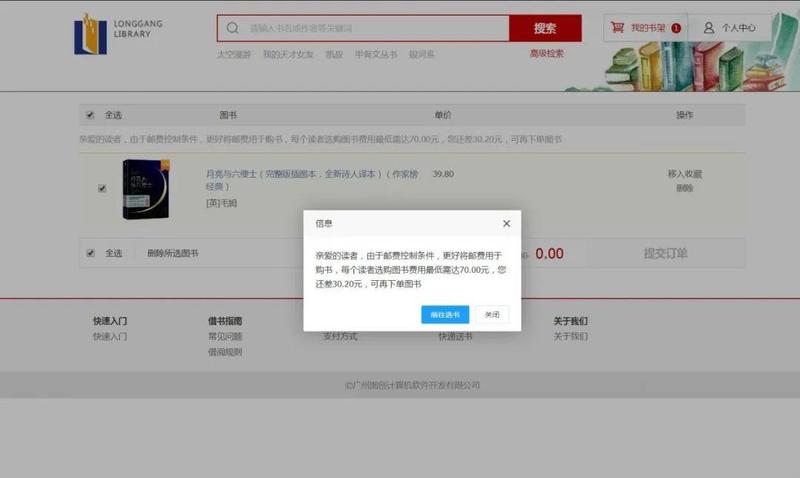 4、加入书架后可选择继续选书或去我的书架结算。点击继续借书,可继续选择图书,点击去我的书架结算,则显示我的书架中的商品,提交订单。由于邮费控制条件,每个读者选购图书费用最低需达70.00元。