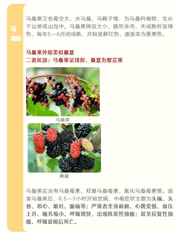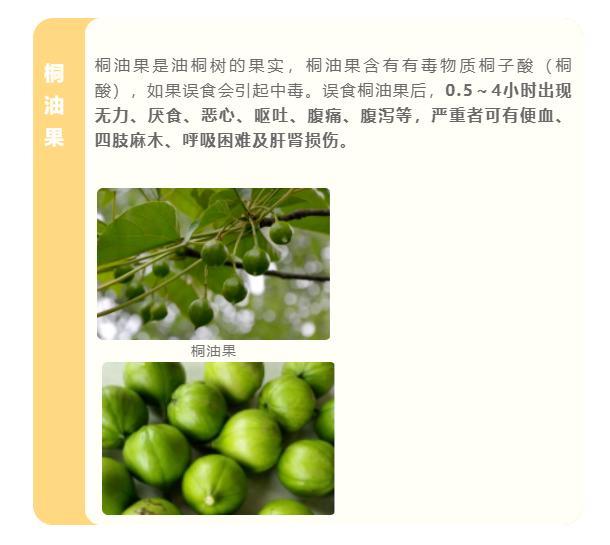 夏季是各种植物结果的季节。我省夏季导致食物中毒的野果主要有马桑果、桐油果、蓖麻子。中毒主要是由农村学生上下学途中采食野果,或孩童野外玩耍时采食野果导致。