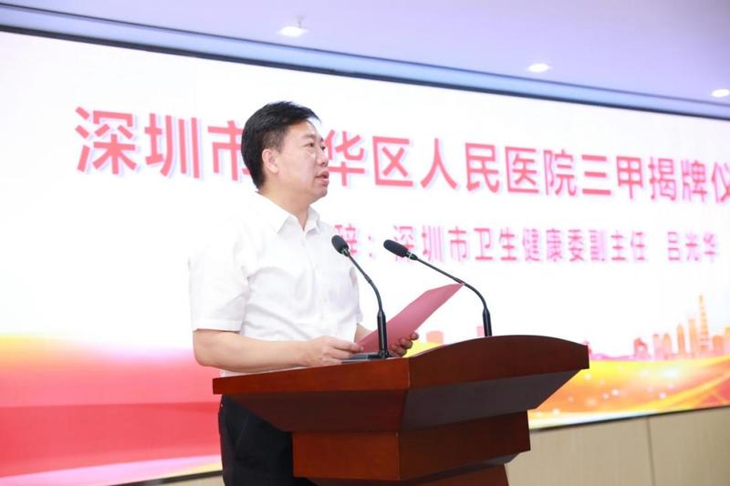 揭牌仪式上,省、市卫健委相关领导向龙华区实现三甲医院零的突破表示祝贺。陈砺表示,“十四五”期间,广东省将认真贯彻落实国家关于推进公立医院高质量发展的部署要求,加快筑牢“顶天立地”医疗卫生大格局,奋力推进新时代广东卫生健康工作走在全国前列。她希望,龙华区继续发挥先行先试作用,强化体系创新、技术创新、模式创新、管理创新,加快优质医疗资源扩容和区域均衡布局,不断满足群众日益增长的医疗卫生服务需求;希望龙华区人民医院以“三甲”揭牌为新起点,进一步加强学科和人才建设、进一步提升医疗技术能力和质量水平,充分发挥区域医疗中心龙头作用,不断增强群众的健康获得感、幸福感、安全感。