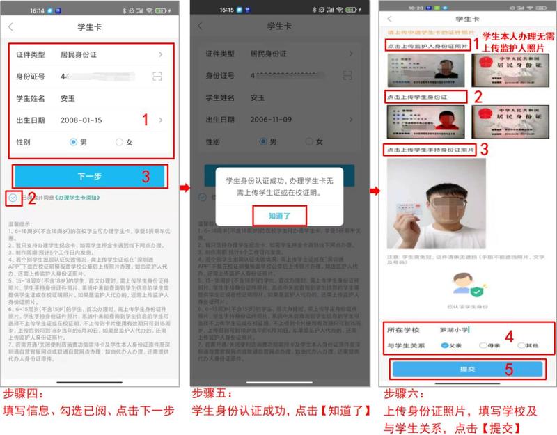 4.若个别学生出现认证失败情况,需上传学生证或在“深圳通APP”下载在校证明模板盖学校公章后上传照片办理。如由监护人代办,还需上传监护人身份证照片。