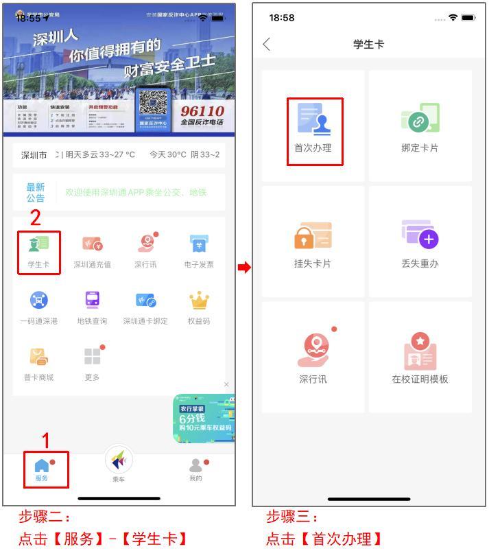 ② 打开深圳通APP,点击【服务】-【学生卡】-【首次办理】