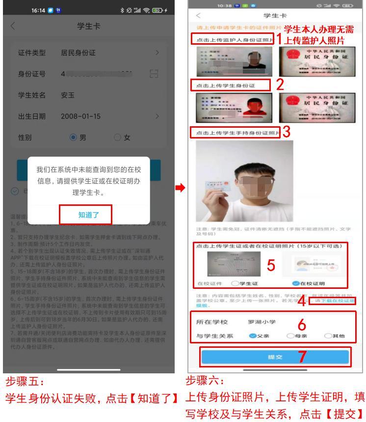 4、若个别学生出现认证失败情况,需上传学生证或在“深圳通APP”下载在校证明模板盖学校公章后上传照片办理。如由监护人代办,还需上传监护人身份证照片。