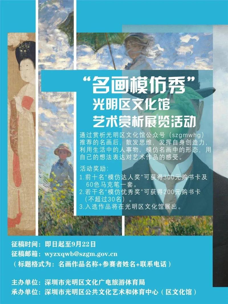 自行选定一幅名画或本文中推荐的名画,了解作品背景后,利用日常生活中的小物品做道具,例如毛巾、玩具、口罩、衣服、食物等,模仿名画中人物的形态,请家人、朋友帮助拍摄照片,并将作品投稿至光明区文化馆邮箱。