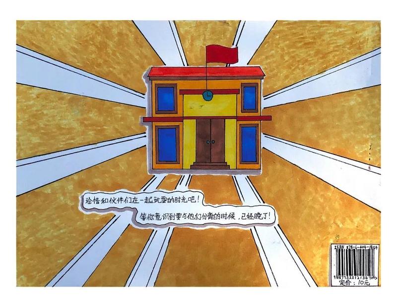 作品完整度较高,有封面、封底、环衬页和正文,既有书名、作者、出版社,还有逼真的ISBN条形码及定价。更可贵的是,作者的用心设计,完全能达到好的图画书只看封面、封底、环衬页就能“说故事”的要求。封面上学校周边到底是四通八达的路还是如太阳般闪耀的金光?封底上学校为什么变小了?环衬页像彩虹一样的颜色想要表达什么?作品的语言也很有节奏,图文并茂,引人入胜。