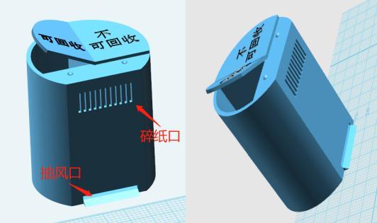 作品介绍:这是一款多功能垃圾桶,内部设置了分区格子,用于可回收与不可回收垃圾存储;底部带有吸尘口,可实现自动感应吸尘;同时提供碎纸功能,确保个人信息安全。(指导教师:刘锡龙)