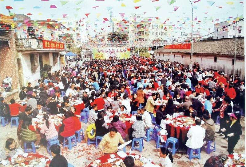 在会餐环节,大家入席聚餐,少不了的就是一道“客家大盆菜”。其中的红焖猪肉、酿蚝豉等客家传统美食,不仅是吉溪人儿时的味道,更是家与乡愁的味道。