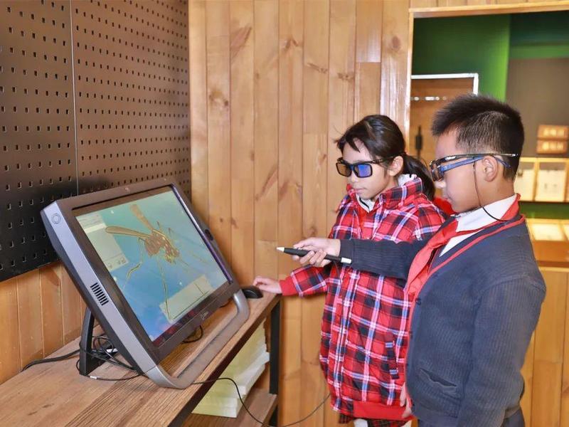 课内,学生可以在昆虫馆的五大特色功能区域进行具身体验学习:科普展示区收藏了1316只昆虫标本,学生可以在这里观察、了解昆虫的身体结构和奇妙的生长过程;情境探秘区内有许多昆虫模型,初学者可以逐渐克服对昆虫的恐惧心理,建立起研究昆虫的兴趣;昆虫工作坊内工具齐全,学生在这里学习制作昆虫标本以作进一步研究;数字交互区设备先进,学生既可以利用3D-VR交互一体机解剖、重组数字标本,也可以通过平板扫一扫,浏览标本盒内昆虫的拓展知识;集中研讨区平时用来展陈标本,上课时可将中岛柜挪开,供一个班级的学生集中研讨。课外,学校组织对昆虫感兴趣的学生开展夜观活动,师生、家长一起走进神秘的山林,近距离感受深圳市丰富的自然资源与生物的多样性。