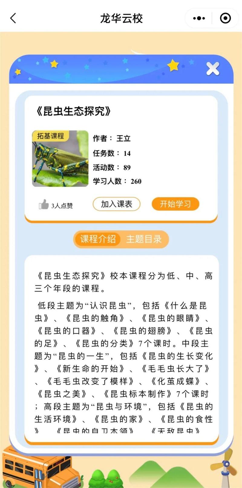 龙华云校的线上《昆虫生态探究》课程以一种全媒体课程的方式让全区的学生都能快乐地学习自然、昆虫知识。它解决了传统昆虫标本馆无法资源共享,难以大范围推广普惠每一位学生的弊端,最大化地激活了教育资源。在这里,学生可以把昆虫馆带回家——观看昆虫微课视频、参与知识问答,还可以线上养蚕、观察蚕宝宝从蚕卵到蚕蛾的成长变化过程,体验沉浸式学习的快乐。
