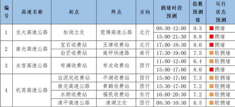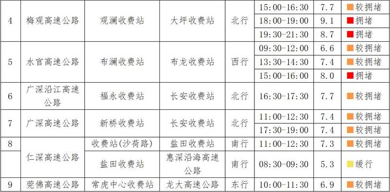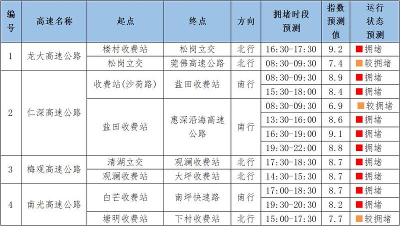 预计假期期间深圳市高速公路交通运行情况有所改善,假期后半段未出现明显的返深高峰,整体运行将处于基本畅通及畅通状态。具体如下图所示: