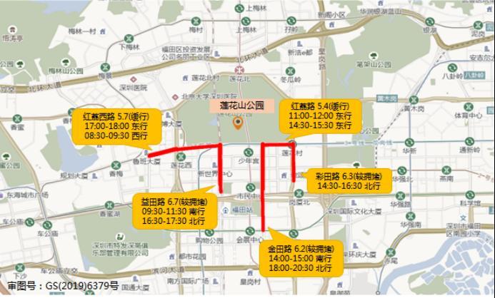 预计莲花山公园周边的红荔西路(景田路-益田路,双向)、红荔路(金田路-彩田路,东行)、金田路(红荔路-福华路,双向)、益田路(红荔路-深南大道,双向)等路段将出现不同程度拥堵。