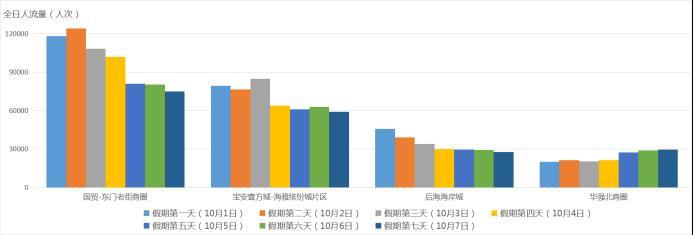 结合往年市内商圈节假日期间的公共交通客流刷卡数据分析,预计国庆假期间国贸-东门老街商圈、宝安壹方城-海雅缤纷城片区、后海海岸城等商圈客流量较大,大部分商圈10月1日-3日将迎来拥堵高峰