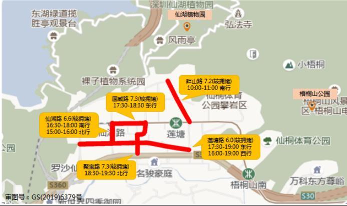 受预约入园、控制人流等疫情防控措施影响,预计仙湖植物园-梧桐山公园片区周边拥堵路段主要分布在仙湖路(国威路-莲塘路,双向)、莲塘路(鹏兴路-畔山路,双向)等。