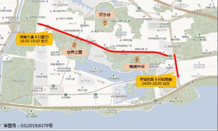 受预约入园、控制人流等疫情防控措施影响,预计世界之窗-锦绣中华-欢乐谷片区周边拥堵路段主要分布在深南大道(沙河东路-侨城东路,东行)和侨城东路(滨海大道-深南大道,北行)。
