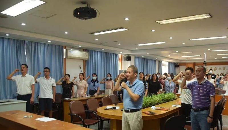 靖轩小学党支部书记、校长叶粤丽同志以“忠诚坚定,廉洁从教”为主题为全体新教师上了一节党课,从传承师者精神、坚守教育初心谈起,勉励新教师要坚定教育初心,坚守教育信念,牢记习近平总书记的教诲,做“四有”教师,为办好人民满意的教育奉献力量。随后,叶粤丽同志领着全体新教师一起宣读誓言。